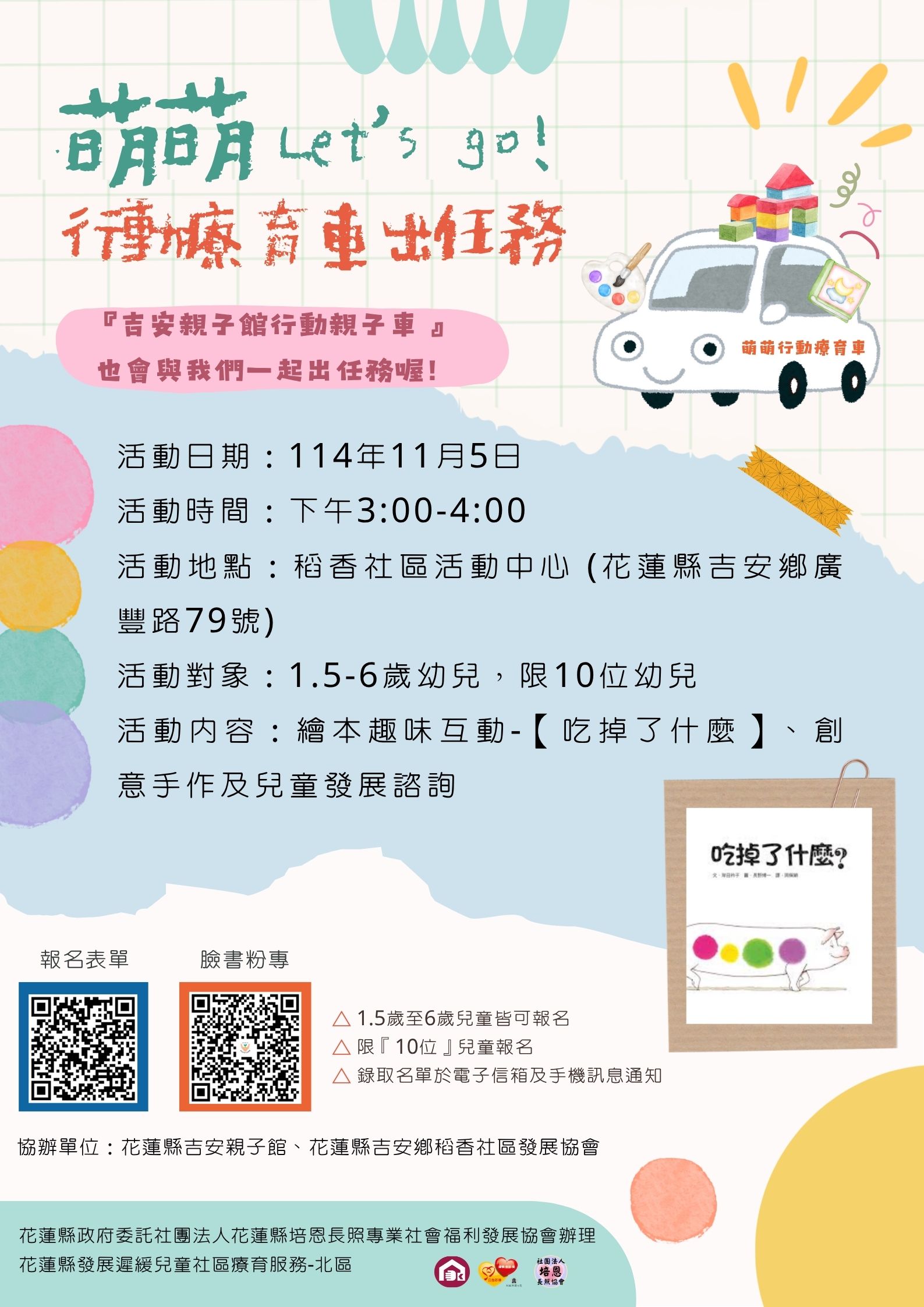 📍 活動內容:繪本趣味互動-【吃掉了什麼?】、創意手作及兒童發展諮詢